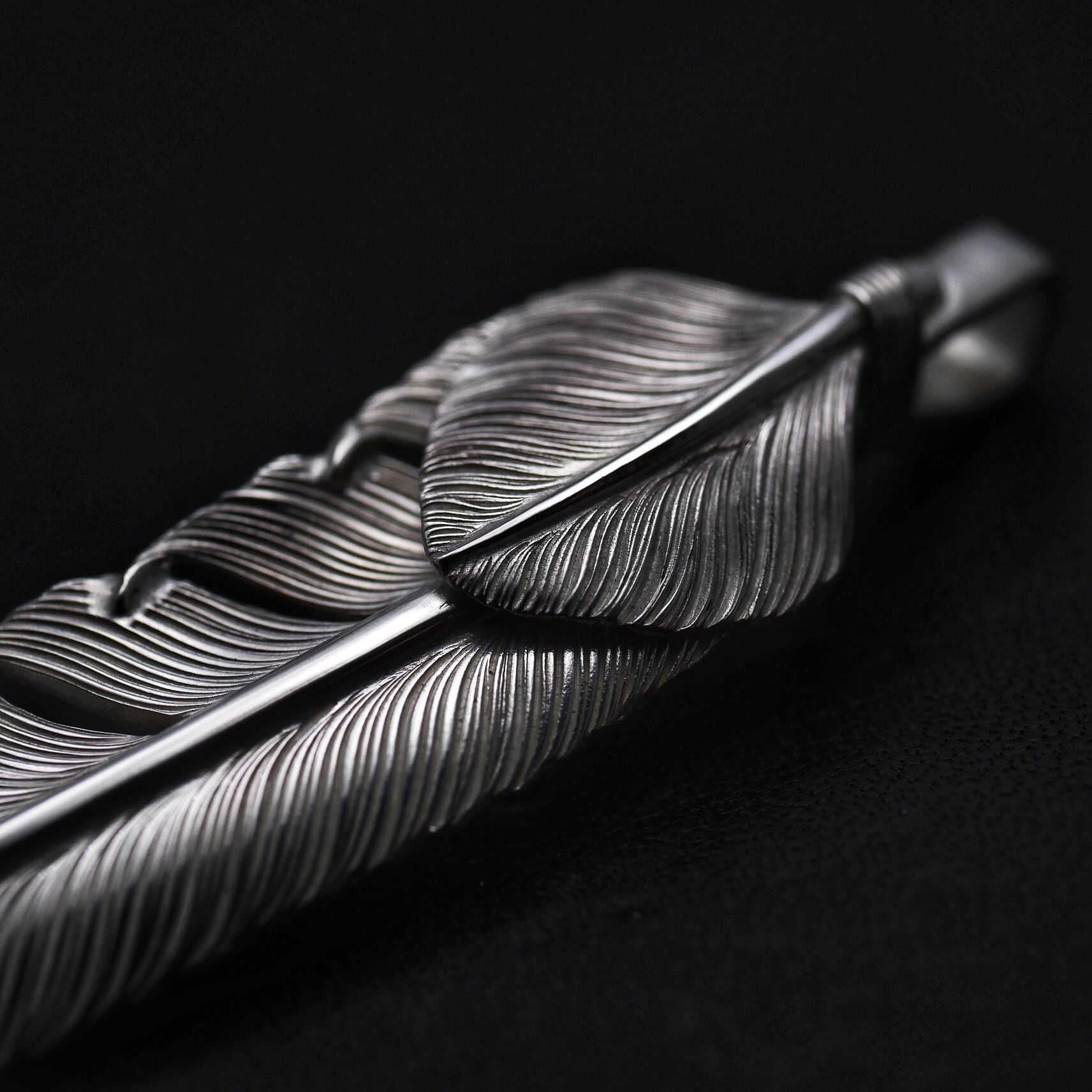羽根のやわらかな質感を表現するため、銀板を糸ノコで切り出し、自作のタガネ(鉄を削り焼き入れした工具)を使いライン一本、一本を手彫りで製作しています。